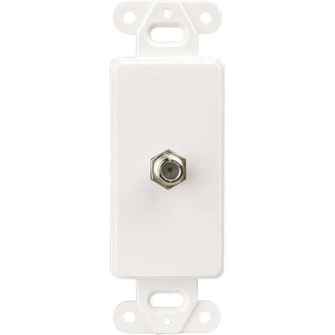 This coaxial wall jack fits in standard decorator wall plate openings. It features decorator mounting strap inserts with connectors and is ideal for cable satellite TVs, DVDs, video applications and outdoor antennas.